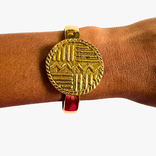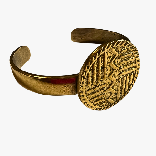 Discover the captivating simplicity of the Duara Bracelet, a testament to the harmonious beauty of circular design. Each handcrafted brass cuff features a striking central disc adorned with intricate, hand-etched patterns by skilled Kenyan artisans. The warm golden tones of the brass enhance the unique details of the centerpiece, creating a bracelet that is both eye-catching and deeply connected to African artistry.