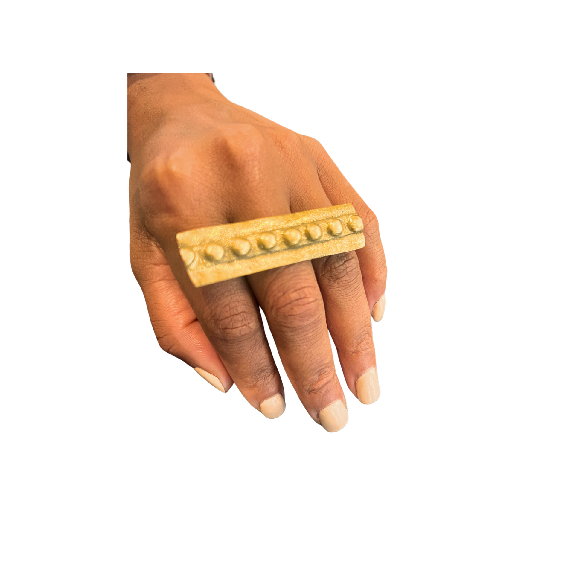 The Kivutio Ring, a bold and distinctive piece, is a handcrafted brass band designed to make a statement. Its unique rectangular bar, spanning two fingers, exudes a powerful and captivating presence. This striking design, inspired by contemporary fashion, is a symbol of individuality and confidence.